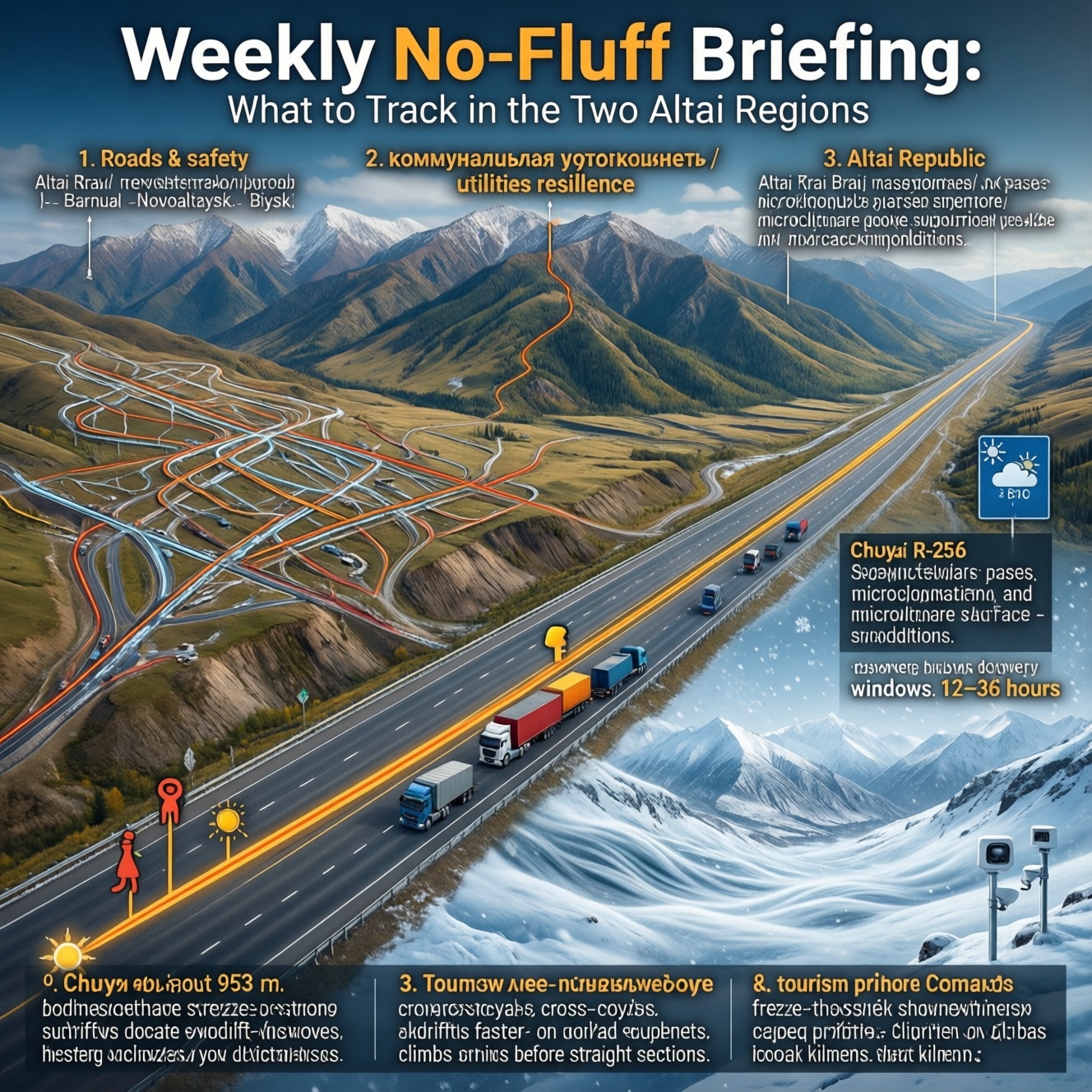 Если собрать в одну картину новости Алтайского края и новости Республики Алтай, то неделя обычно складывается из трёх потоков: дорожная обстановка, коммунальная устойчивость и туристический спрос. У регионов разная «физика»: в крае ключевые риски концентрируются вокруг транспортных коридоров и крупных узлов (Барнаул—Новоалтайск—Бийск), а в Республике Алтай — вокруг горных участков и перевалов, где решает микроклимат и состояние покрытия. Из практики мониторинга для бизнеса: логисты смотрят не только на ДТП, но и на режимы ограничения движения для тяжёлых фур; от этого зависит окно доставки на 12–36 часов. А малый сервис (кафе, шиномонтаж, гостиницы) на этой неделе живёт по простому правилу: как только меняется трафик на Чуйском тракте, касса «переезжает» вместе с потоком машин.